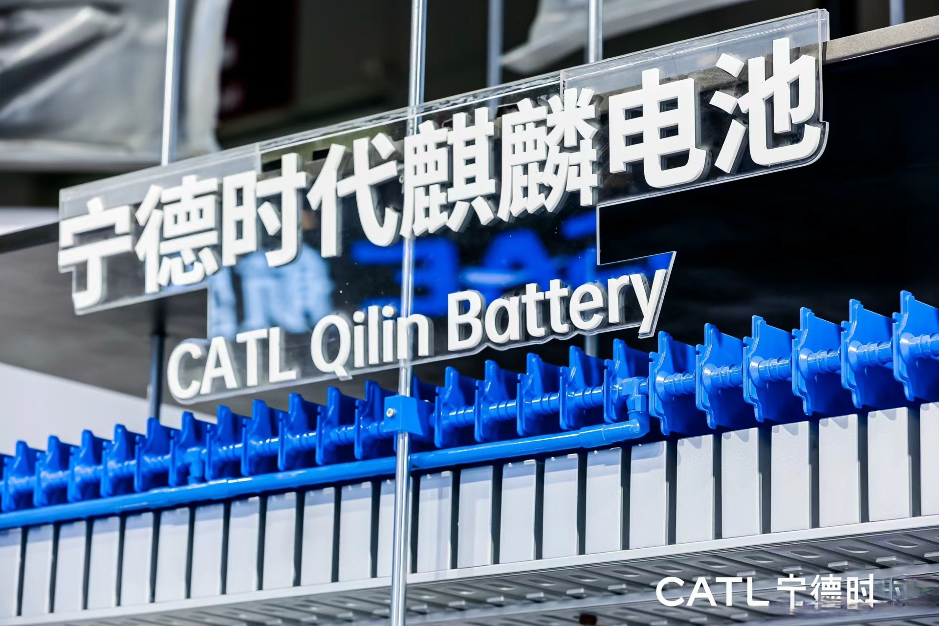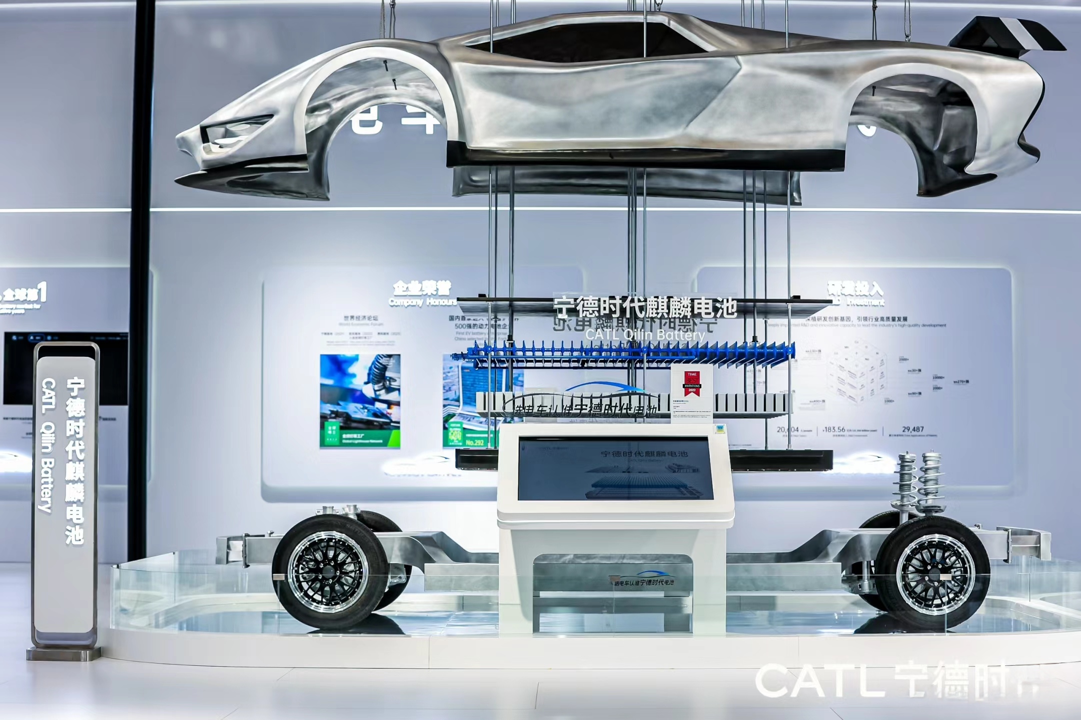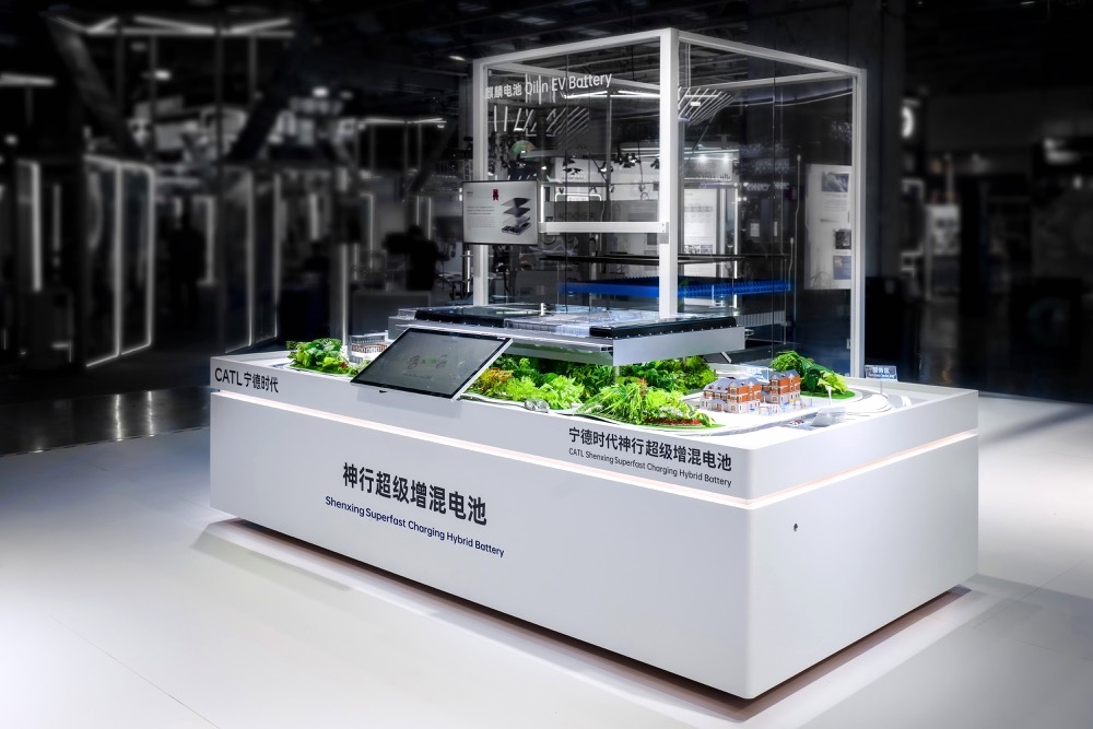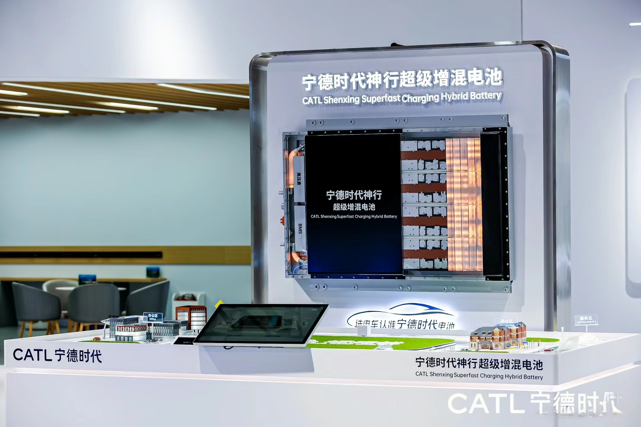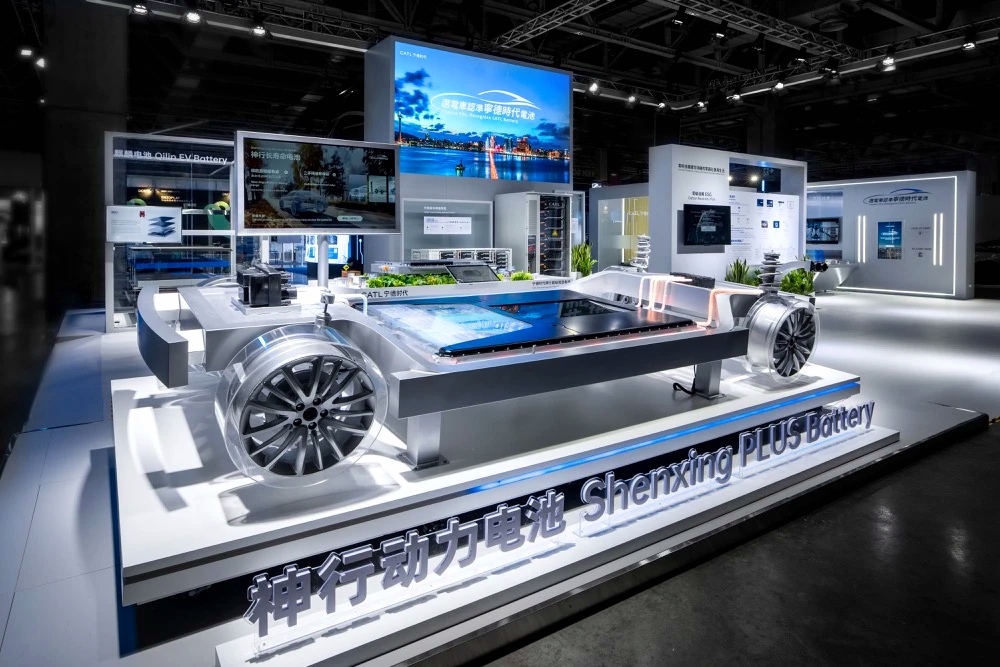 產(chǎn)品展示區(qū)展示寧德時代最新的電池產(chǎn)品和技術,如高能量密度電池、快充技術等。