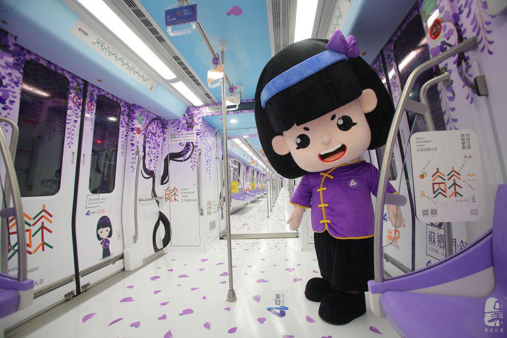 為迎接5月20日在南京舉行的首屆江蘇發(fā)展大會(huì),4號(hào)線專門(mén)推出了“錦繡蘇”號(hào)專列。紫藤花有著熱烈歡迎的寓意,表達(dá)對(duì)江蘇游子榮歸故里的歡迎之情。