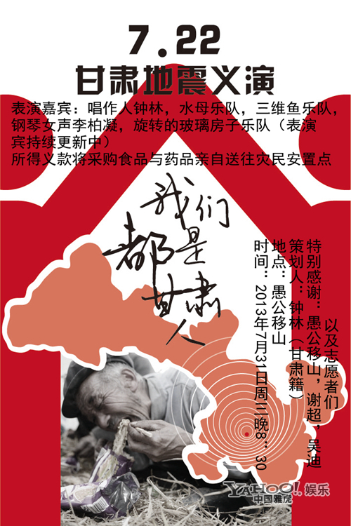 由甘肅天水籍音樂人鐘林發(fā)起組織的“我們都是甘肅人”主題賑災義演,將于7月31日在北京“愚公移山LIVE HOUSE”舉行,當晚,除了鐘林獻唱外,還將有五組藝人為本次義演登臺獻藝,他們分別是三維魚樂隊,,水母樂隊,“民謠女聲” 談麗君(甘肅天水籍),“鋼琴女聲”李柏凝,旋轉(zhuǎn)的玻璃房子樂隊。用鐘林的話來說,這將是一場充滿“文藝范兒”的義演,據(jù)悉,本次義演的全部收入,將用來采購急需物資,由專人負責送往災區(qū)安置點,為在此次地震中受災的人們,盡一點綿薄之力。