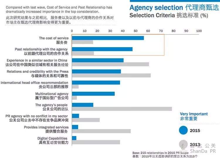 “57%的營(yíng)銷(xiāo)人員將服務(wù)費(fèi)作為甄選的首要因素,該比例2013年僅為13%,”R3公司執(zhí)行董事Sabrina Lee介紹:“單憑這一點(diǎn),我們就可以估計(jì)到中國(guó)公關(guān)業(yè)將要面臨新的挑戰(zhàn)與面貌。”