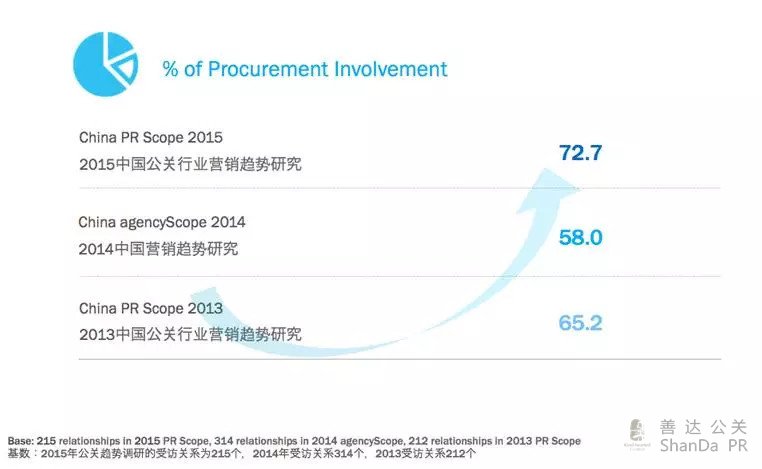 該研究同時(shí)跟進(jìn)了公關(guān)公司在合作關(guān)系中采購(gòu)流程的參與度。2013年65%的公司生產(chǎn)自己占主導(dǎo)地位,如今已升至72.5%。