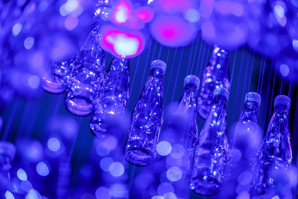 體驗區(qū)內(nèi)多個1664藍(lán)色鈷玻璃瓶錯落有致地懸掛于頂,當(dāng)來賓們穿過以1664瓶身為形的晚宴入口,步入流動的長廊,