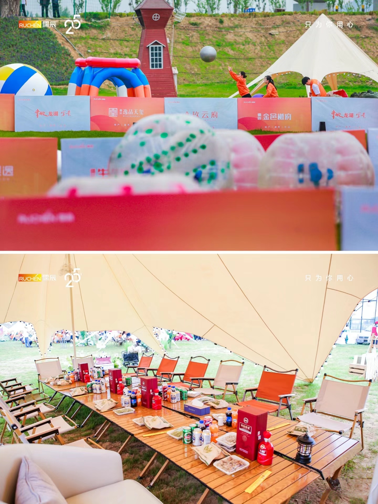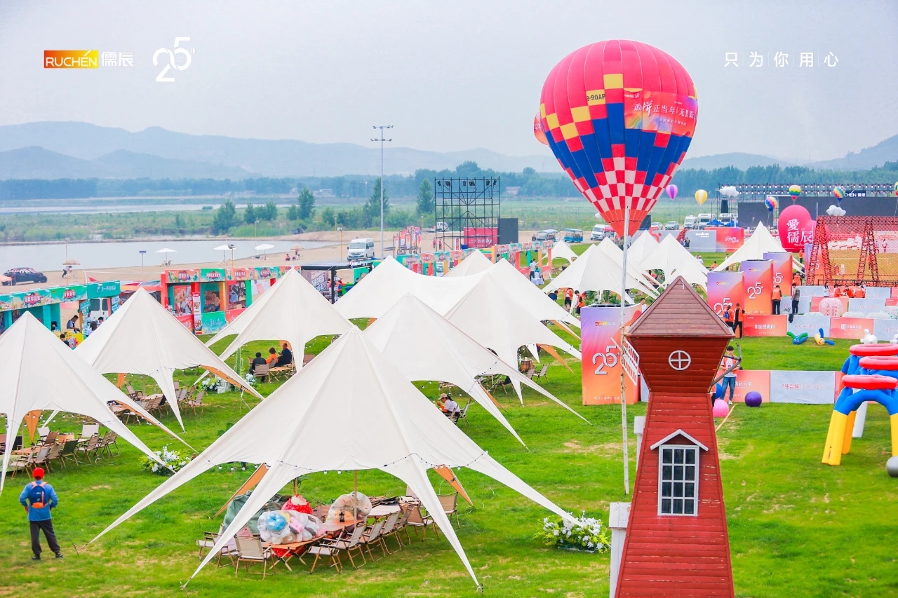 露營草地的精心布置:在松山的綠林與草坪上,露營草地成為了慶典活動的重要一環(huán)。草地上鋪設(shè)了柔軟的草坪,設(shè)置了各種露營裝備,如帳篷、野餐墊、燒烤架等,營造出一個輕松愉快的戶外露營氛圍。同時,草地上還擺放了儒辰集團的標志和周年慶典的橫幅,增強了活動的主題感和歸屬感。