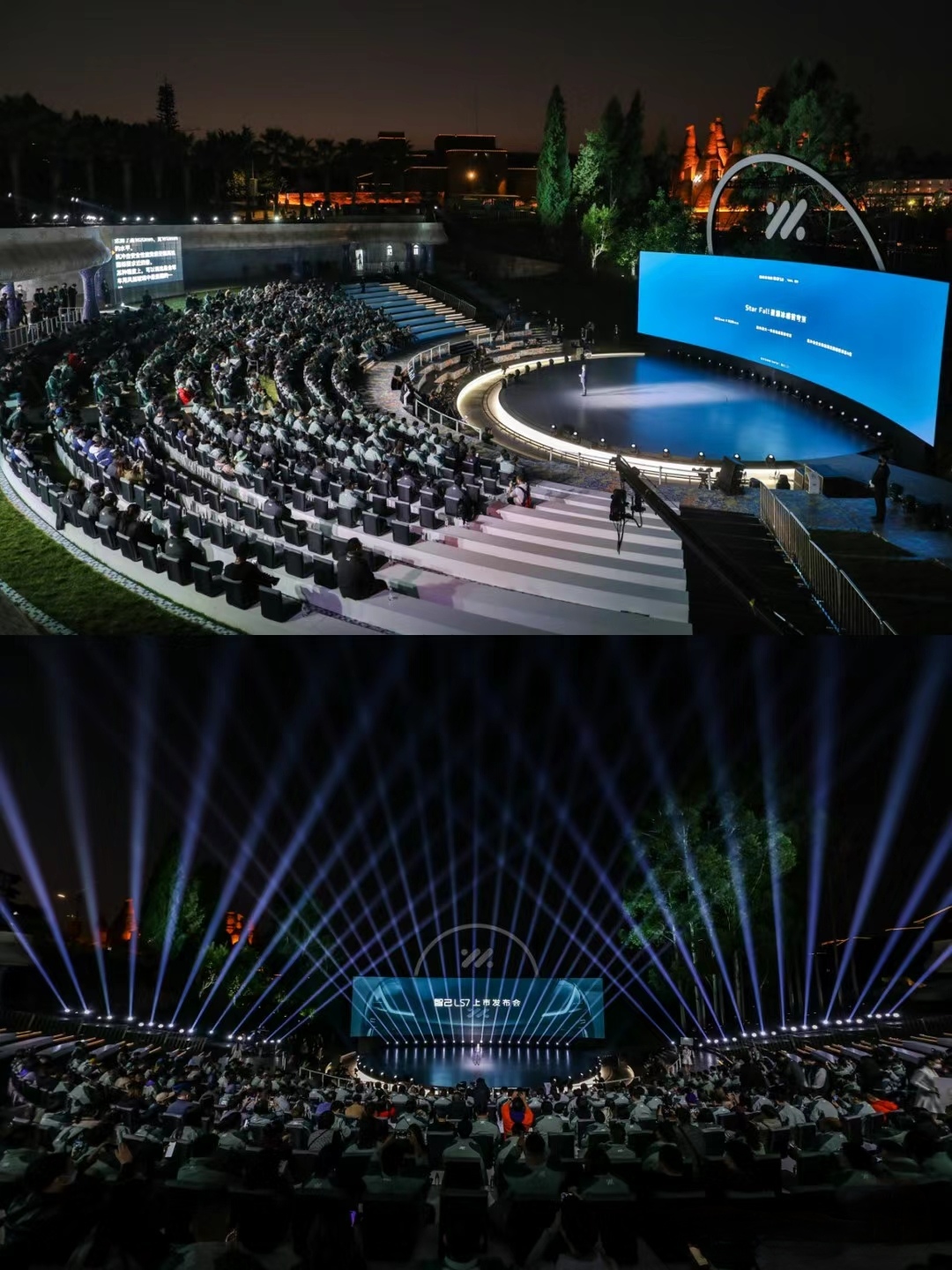 舞臺(tái)現(xiàn)場(chǎng)吊裝了直徑約14米的圓環(huán)發(fā)光裝置,與場(chǎng)地下沉式舞臺(tái)形狀相結(jié)合,光影變換間,發(fā)布會(huì)主角車型智己LS7驚艷亮相。