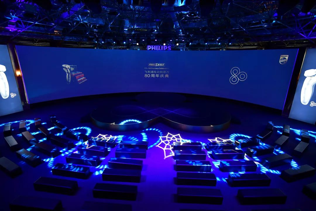 內場很好地結合了空中舞臺的特性,打造了一個“80”的形狀。舞臺中間一面大大的弧面屏,主屏邊上則放置了六面小副屏用來展示剃須刀產品。